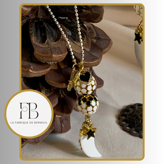 Sautoir "Irène", perles à facettes dorées et émaillées Noir et Blanc , or 18k et zircon