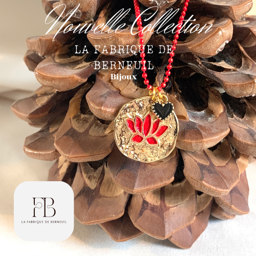 Collier "Lotus" Chaîne et médaillon Rouge agrémenté de son petit cœur noir.