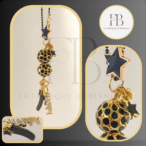 Sautoir "Irène", perles à facettes dorées et émaillées NOIR, or 18k et zirconium, création artisanale
