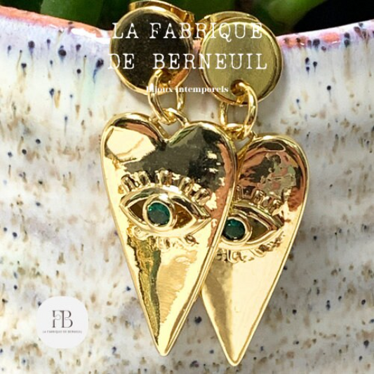 Boucles d'oreilles Bohème, cœur et mauvais œil, acier inoxydable plaqué or 18k et zircon vert